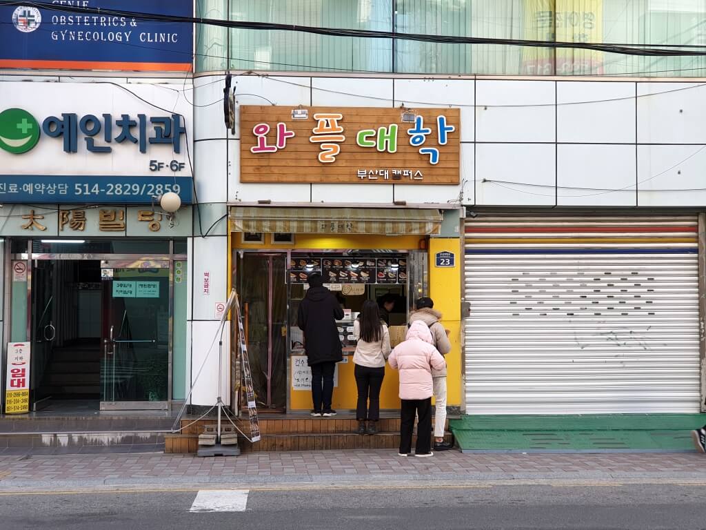 하지만 부산대에는 많은 호떡집이 있음에도 불구하고, 길거리 포장마차에 있을 법한 와플가게가 정식 매장으로 영업을 하고 있습니다.